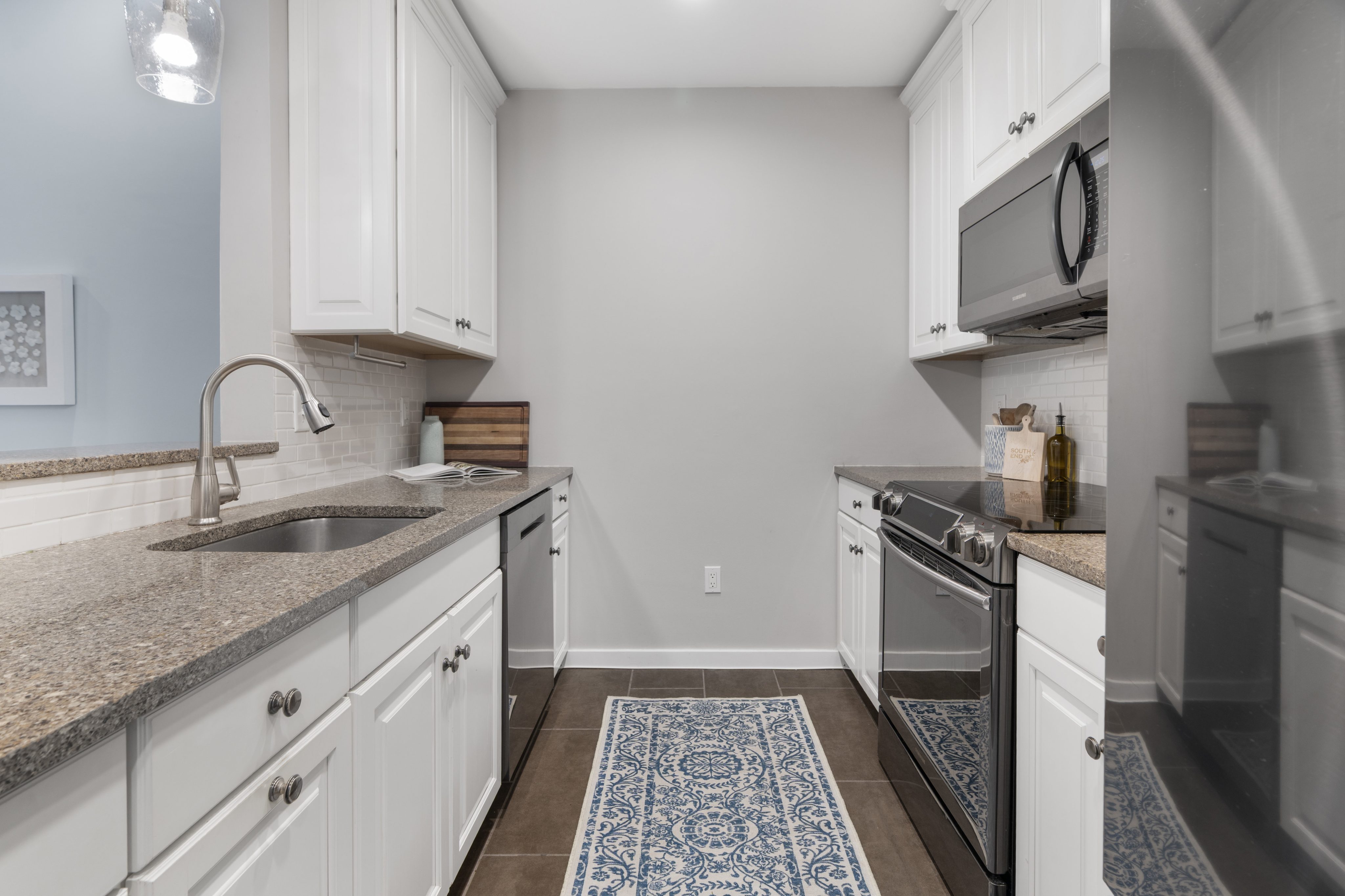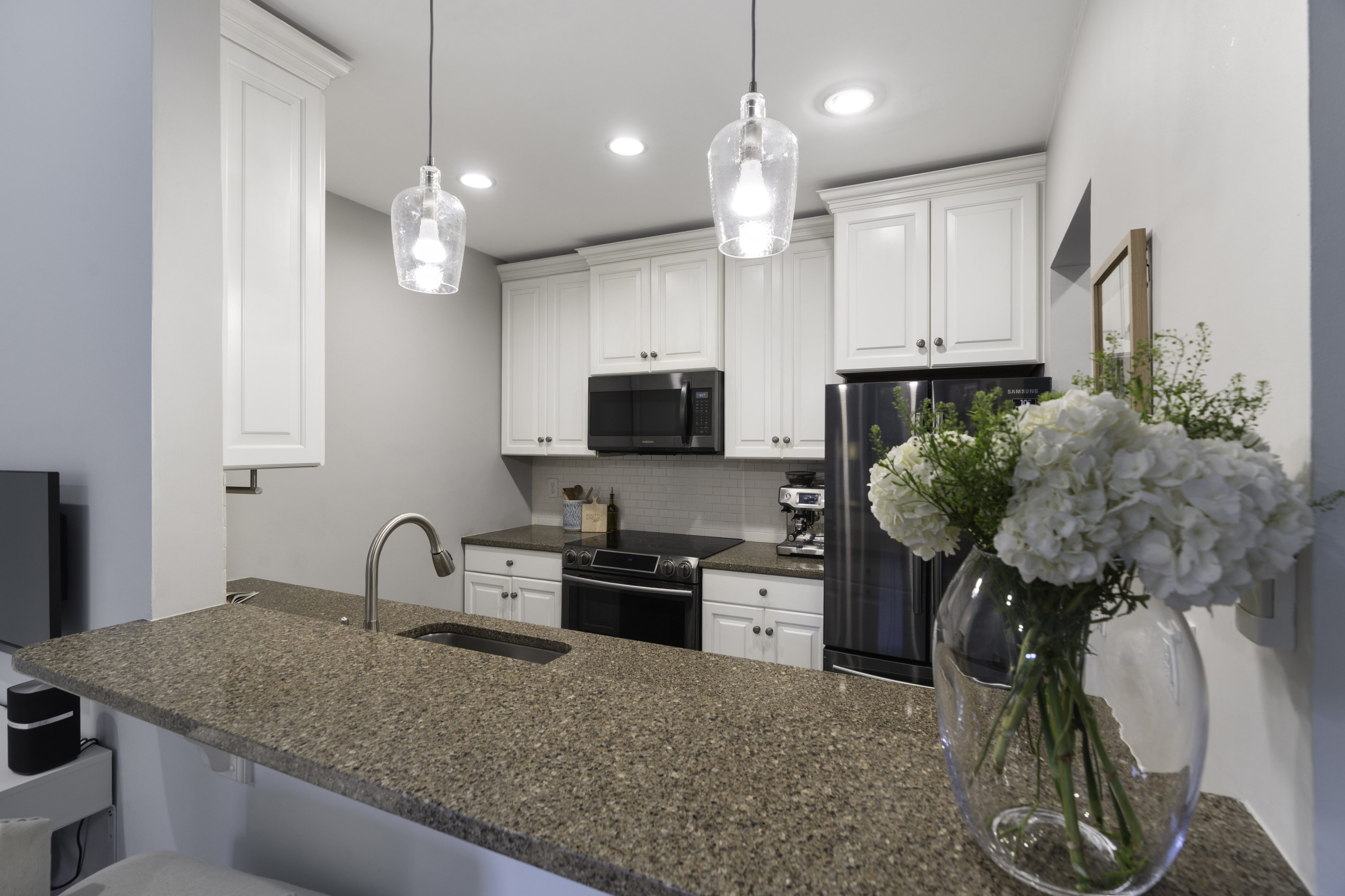A built-in high-top seamlessly connects the living space to the kitchen, making it easy to entertain while cooking your favorite meals. The kitchen is outfitted with stainless steel appliances and offers ample cabinet space for all your storage needs.