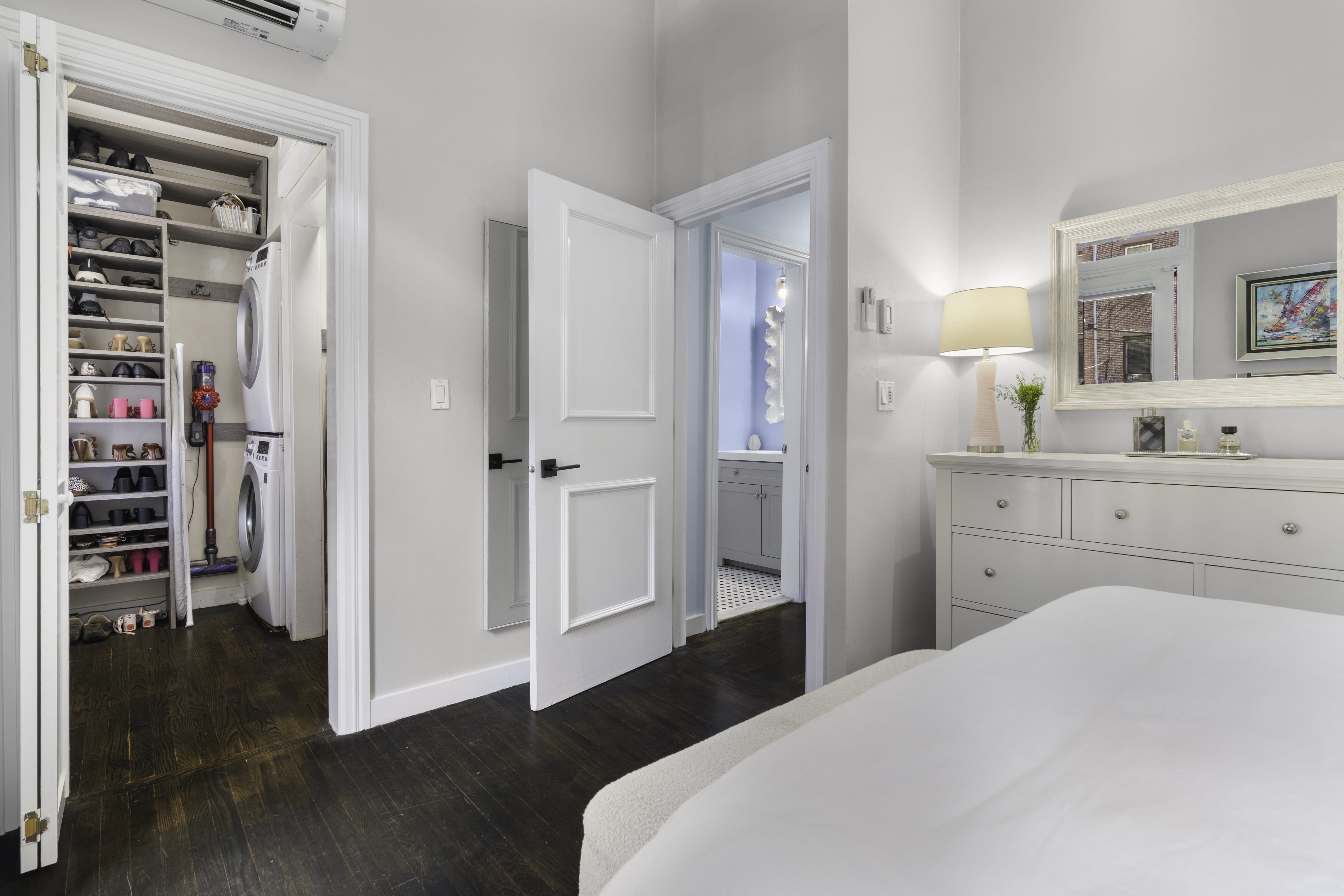Down the hall, you'll find a spacious bathroom featuring a full tub and clean, modern finishes—conveniently located for both you and guests. A king-sized bedroom with a generous walk-in closet, complete with built-in shelving and a full-sized washer and dryer.