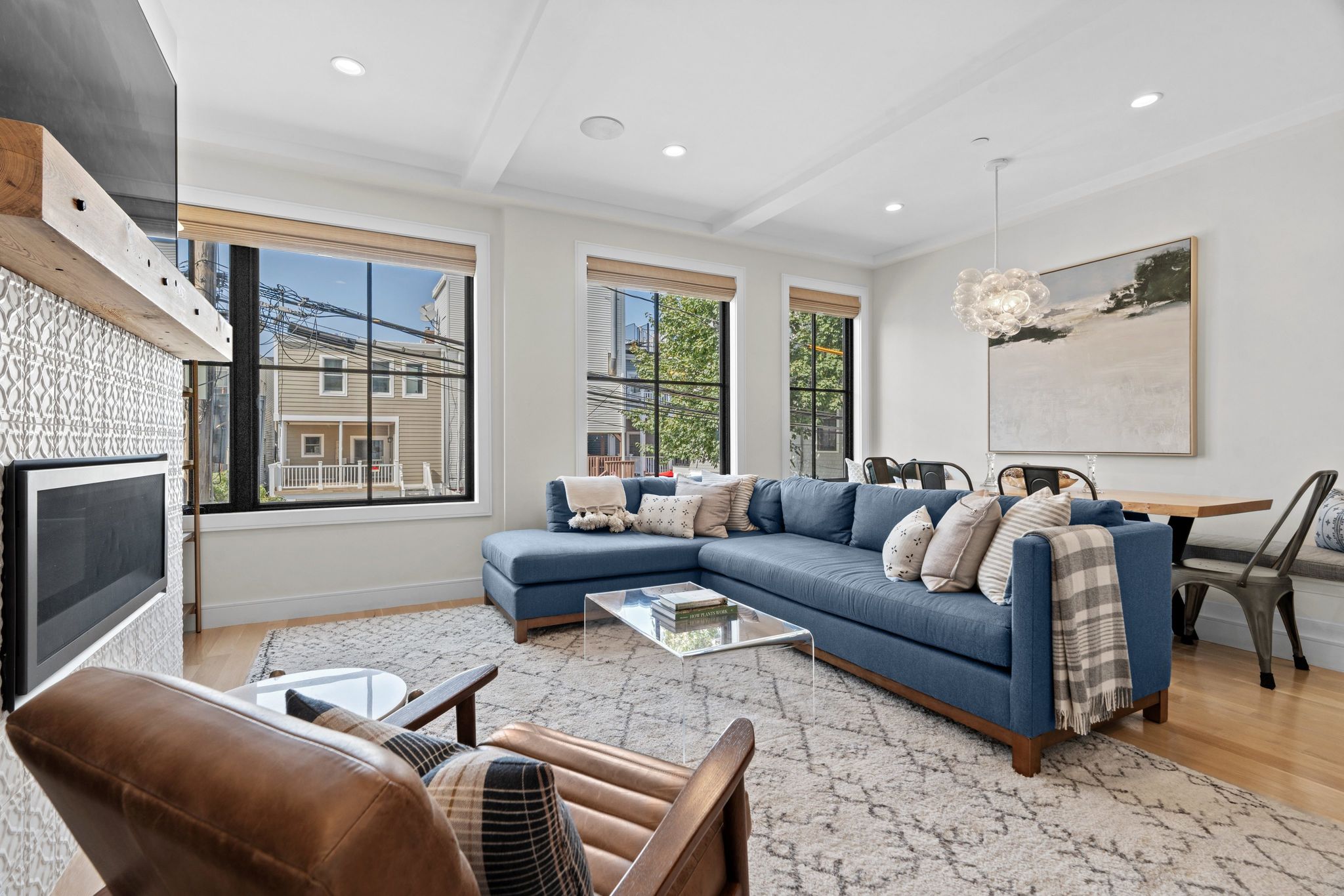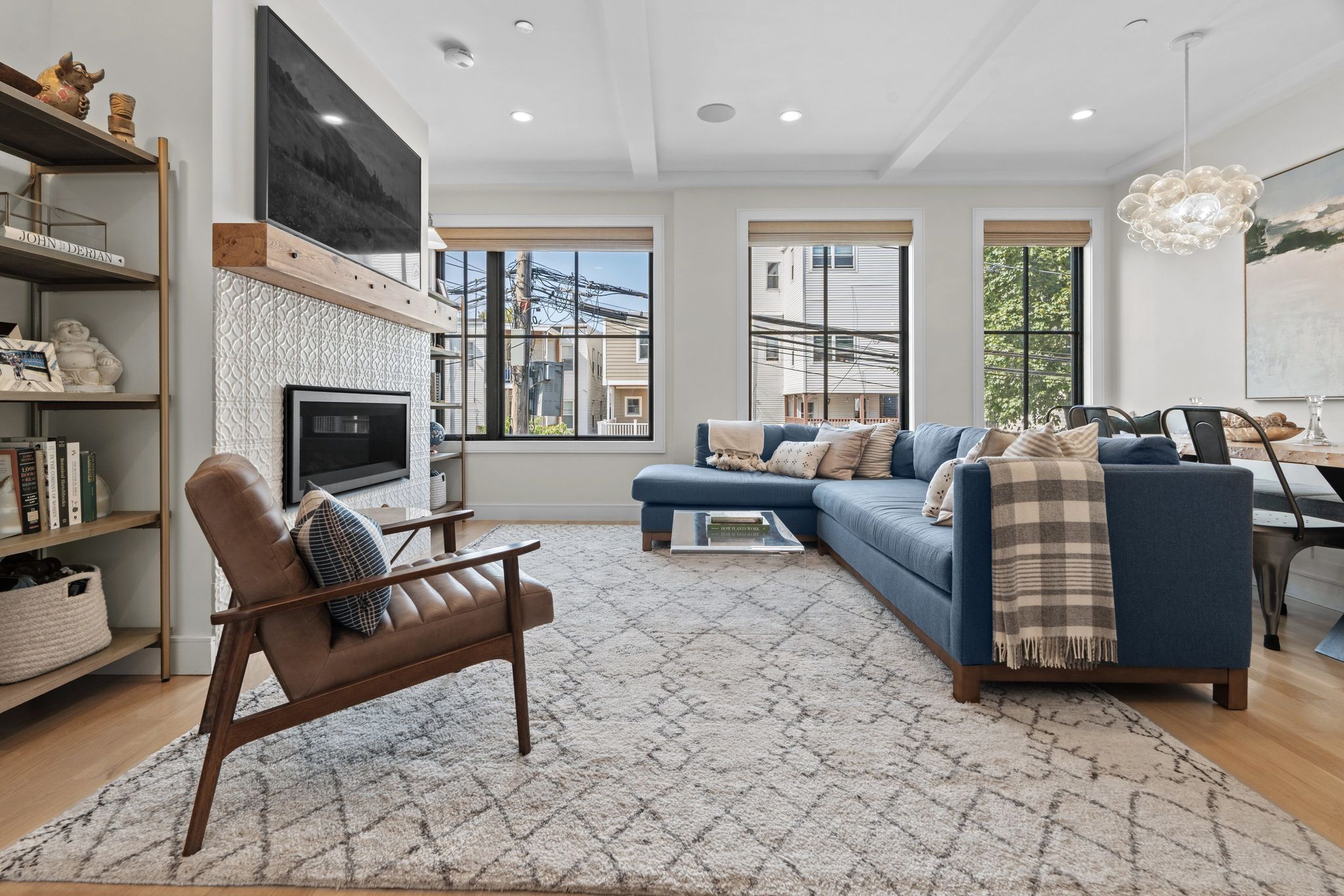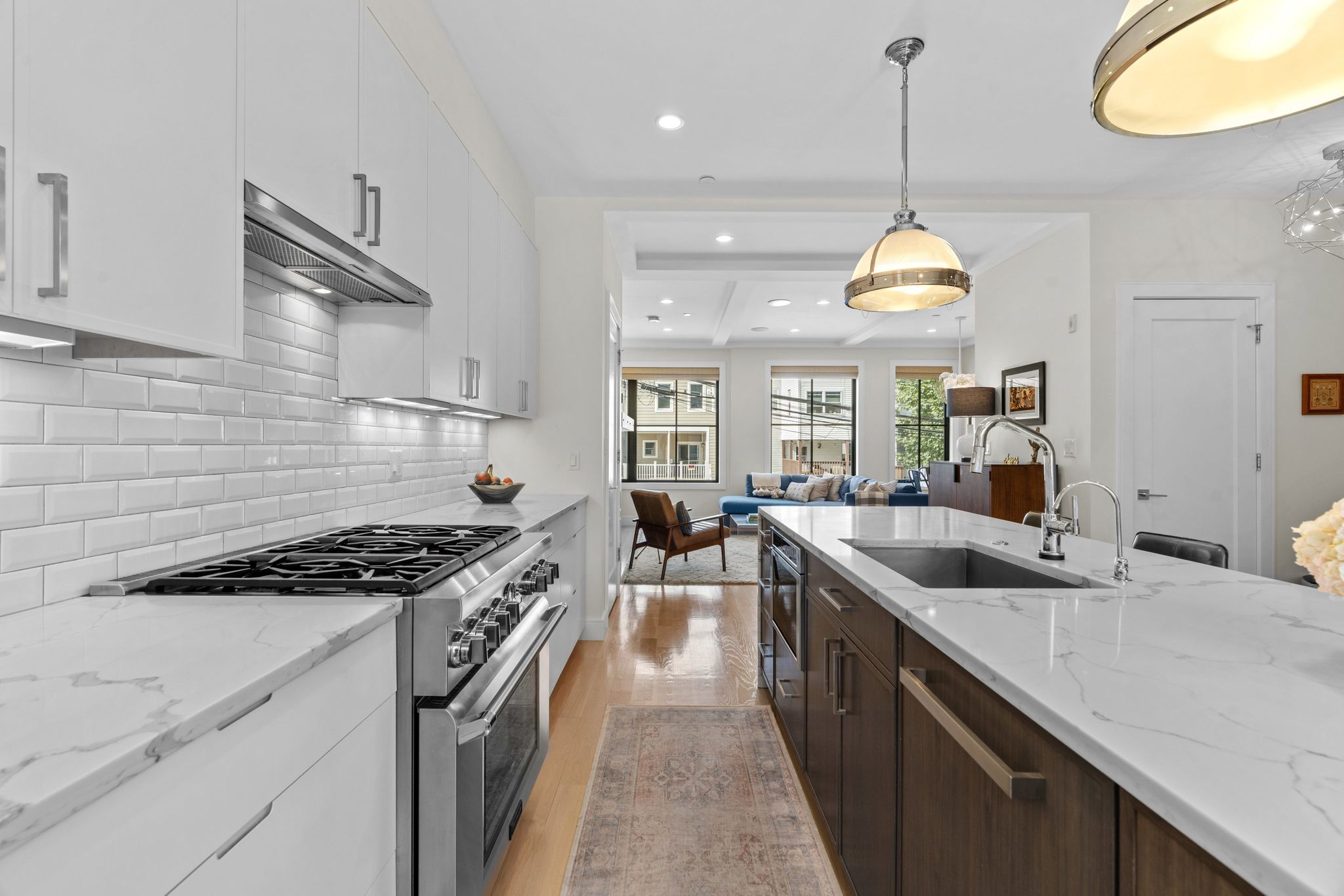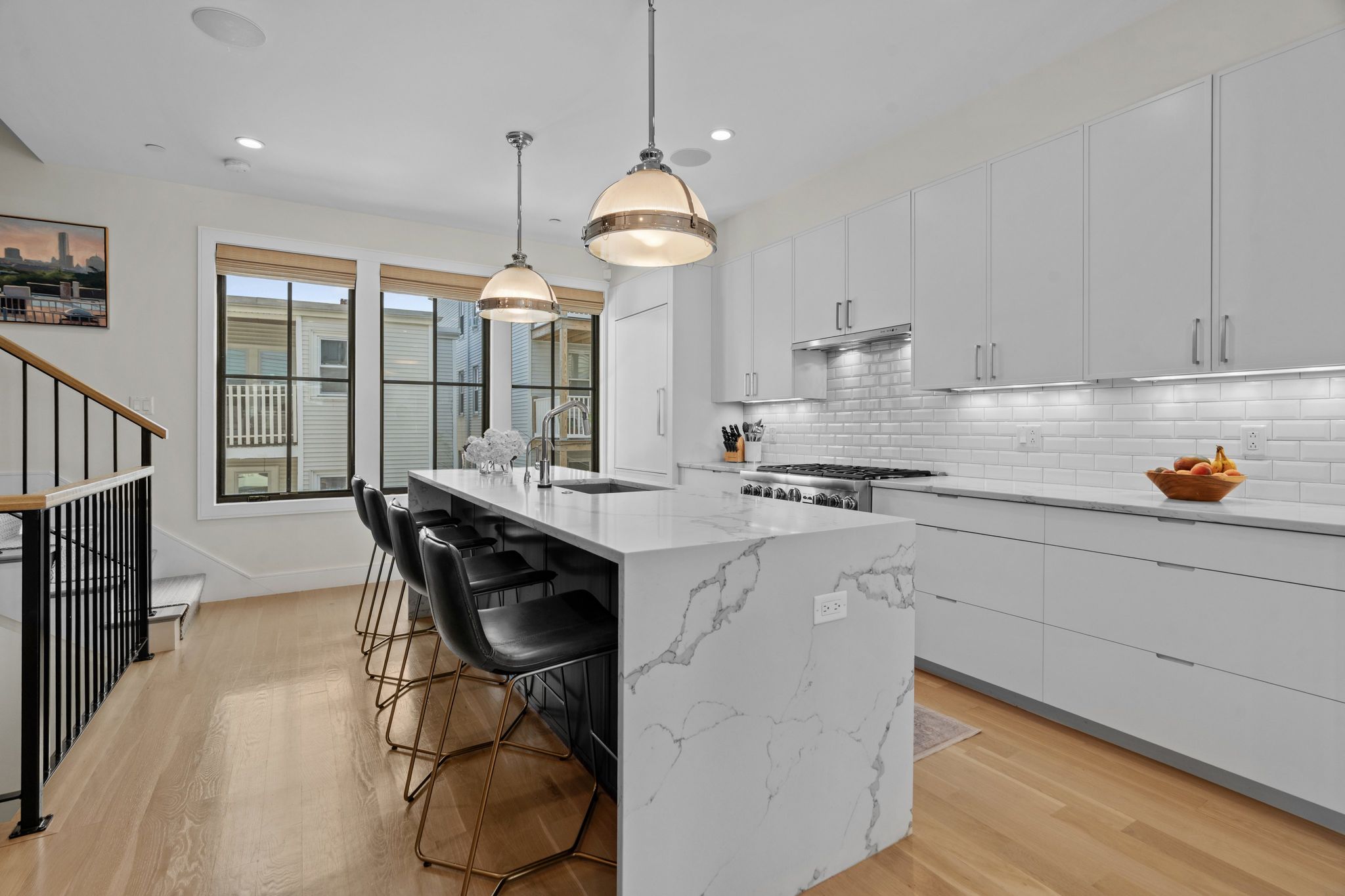 This meticulously designed South Boston townhome is an urban oasis offering luxury, space and style. This expansive home features 4 bedrooms, 3.5 bathrooms, private roofdeck, enormous fenced-in backyard and rare 2 car garage parking. Enter through your private garage into a dedicated mudroom, complete with custom built-ins. Upstairs the main living level impresses with a designer kitchen featuring Thermador appliances and added pantry. The open-concept layout flows seamlessy into the large dining area and sunlit living room, anchored by a gas fireplace. A stylish half-bath completes this level.