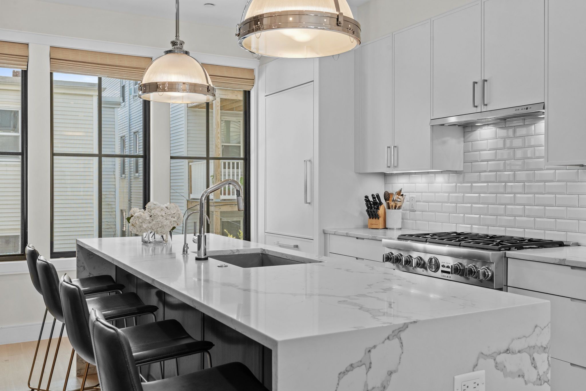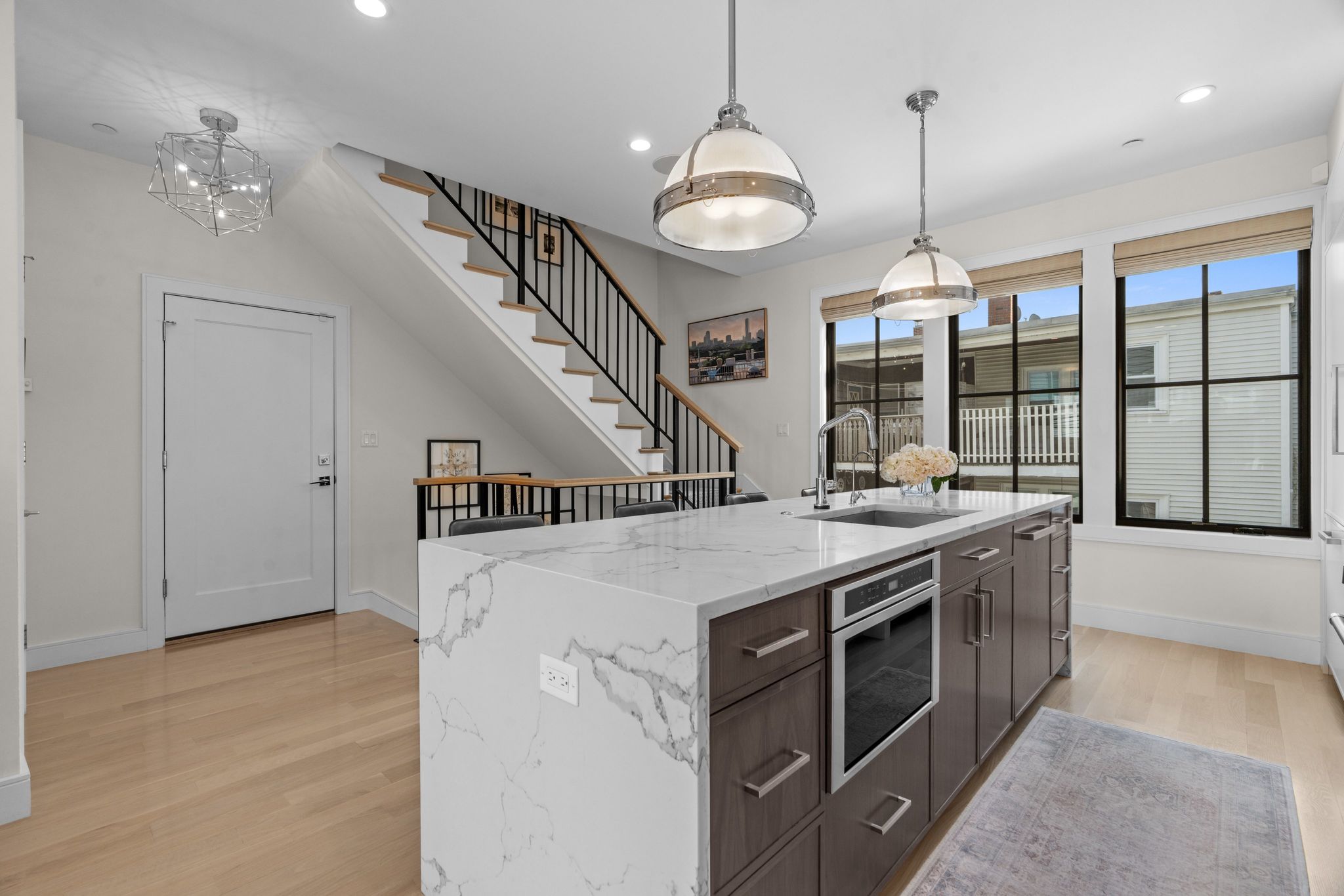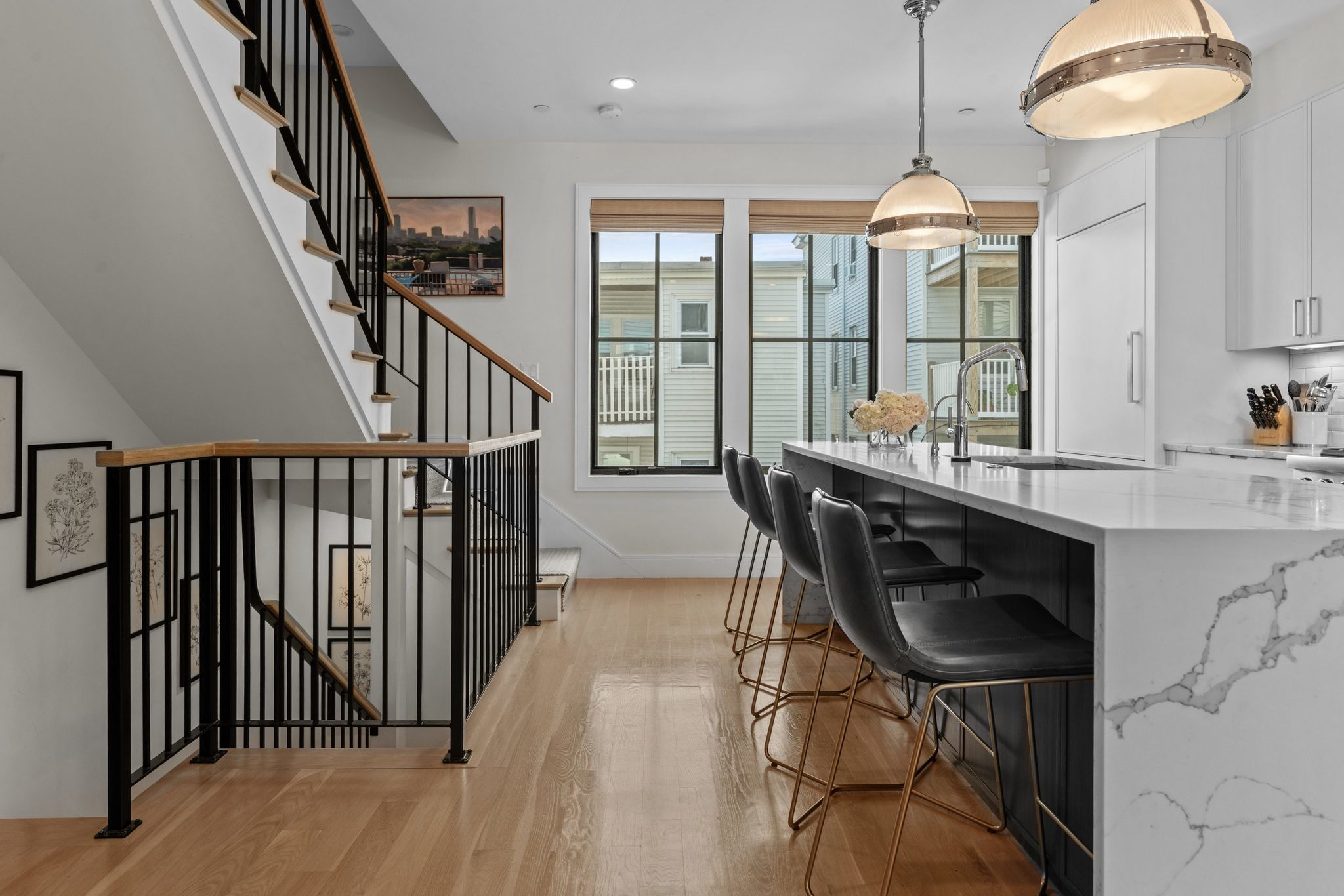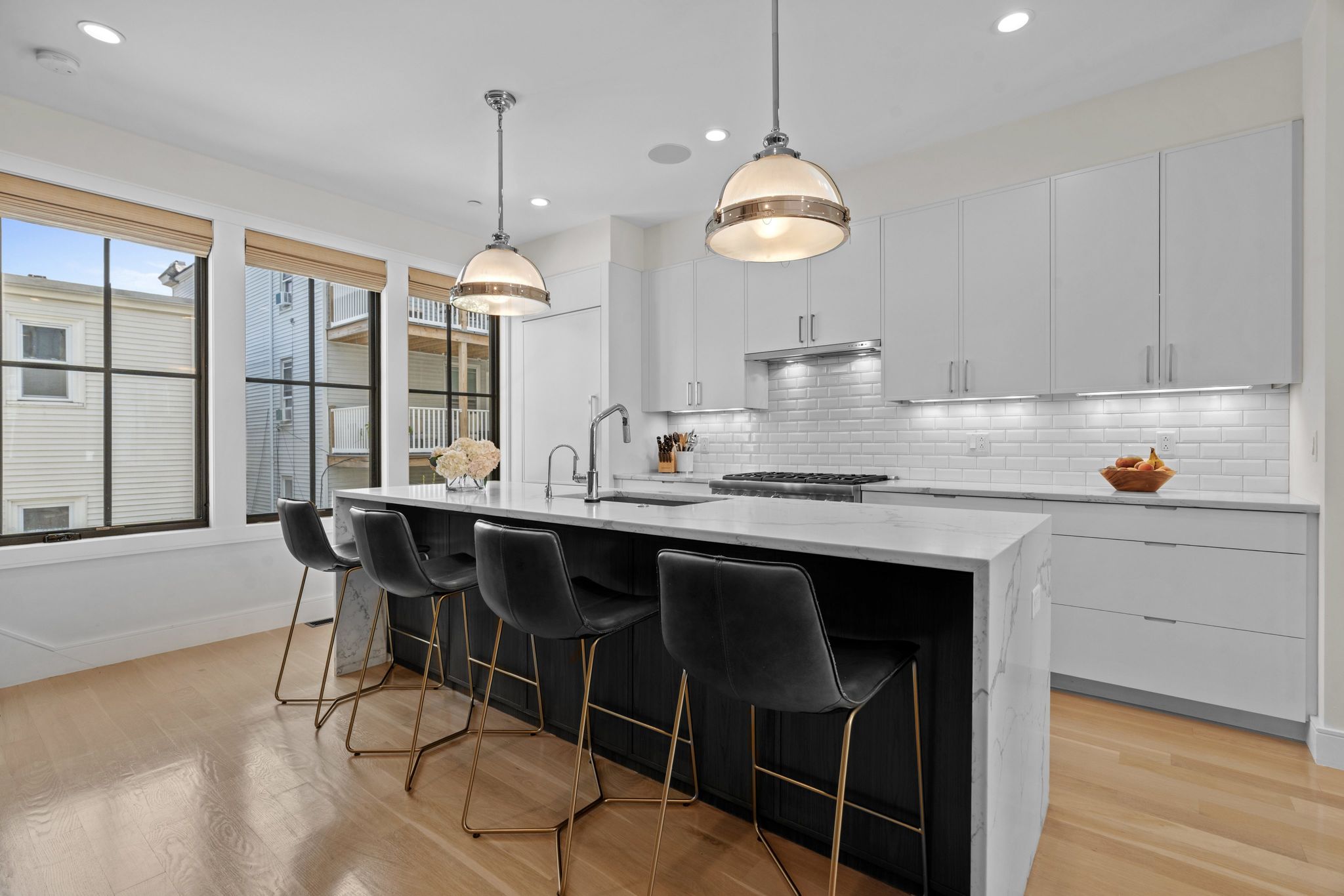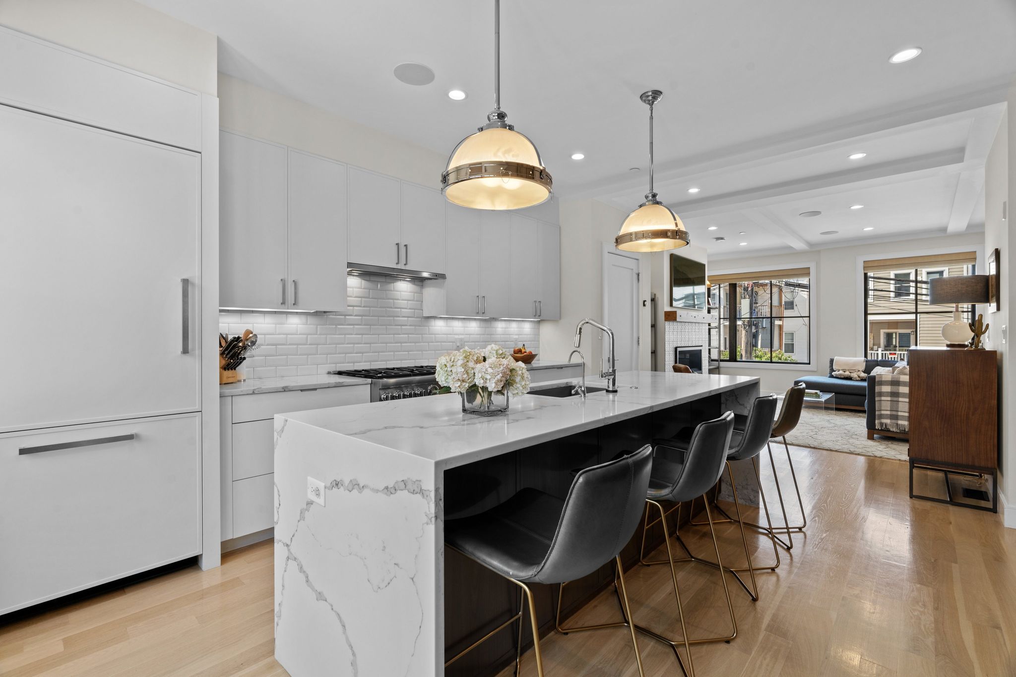 This meticulously designed South Boston townhome is an urban oasis offering luxury, space and style. This expansive home features 4 bedrooms, 3.5 bathrooms, private roofdeck, enormous fenced-in backyard and rare 2 car garage parking. Enter through your private garage into a dedicated mudroom, complete with custom built-ins. Upstairs the main living level impresses with a designer kitchen featuring Thermador appliances and added pantry. The open-concept layout flows seamlessy into the large dining area and sunlit living room, anchored by a gas fireplace. A stylish half-bath completes this level.
